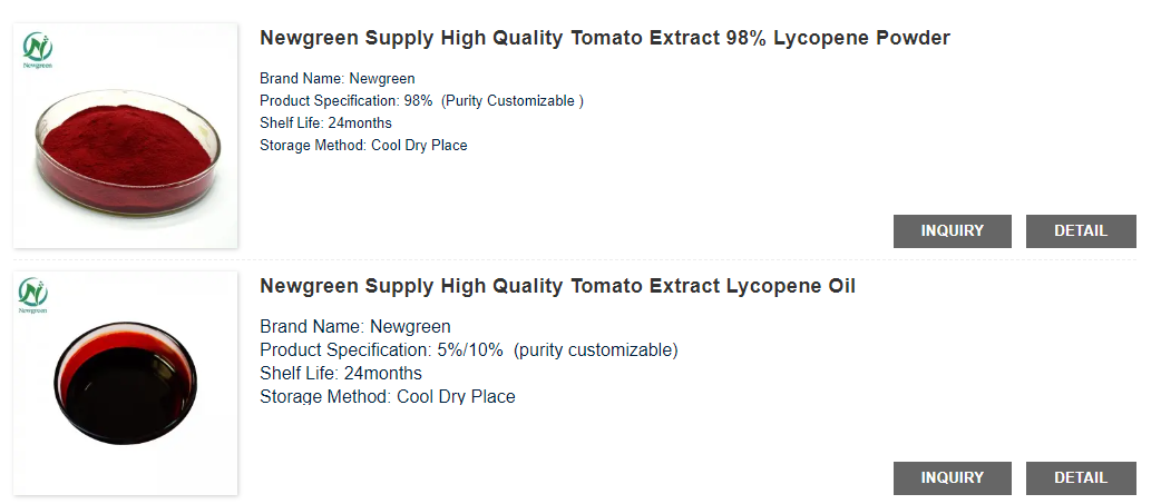 लाइकोपीन एक प्राकृतिक कैरोटीनॉयड है, जो मुख्य रूप से टमाटर जैसे फलों और सब्जियों में पाया जाता है। इसकी रासायनिक संरचना में 11 संयुग्मित द्विबंध और 2 असंयुग्मित द्विबंध होते हैं, और इसमें प्रबल एंटीऑक्सीडेंट गतिविधि होती है।