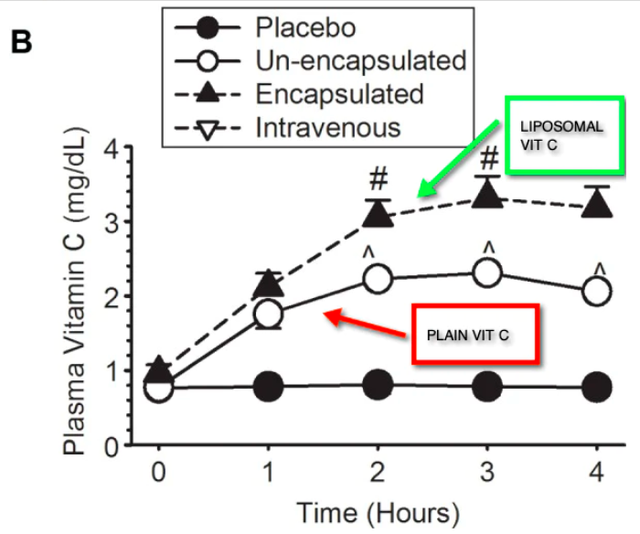 2016. gadā veiktā pētījumā, kurā piedalījās 11 subjekti, atklājās, ka liposomās iekapsulēts C vitamīns ievērojami paaugstināja C vitamīna līmeni asinīs, salīdzinot ar tādas pašas devas (4 grami) neiekapsulētu (neliposomālu) uztura bagātinātāju.