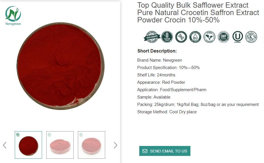 Crocin is the colored component and main component of saffron. Crocin is a series of ester compounds formed by crocetin and gentiobiose or glucose, mainly composed of crocin I, crocin II, crocin III, crocin IV and crocin V, etc. Their structures are relatively similar, and the only difference is the type and number of sugar groups in the molecule.. It is an uncommon water-soluble carotenoid (dicarboxylic acid polyene monosaccharide ester).
