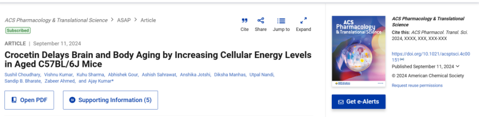 As we age, the function of human organs gradually deteriorates, which is closely related to the increased incidence of neurodegenerative diseases. Mitochondrial dysfunction is considered to be one of the key factors in this process. Recently, the research team of Ajay Kumar from the Indian Institute of Integrated Traditional Chinese and Western Medicine published an important research result in ACS Pharmacology & Translational Science, revealing the mechanism by which crocetin delays brain and body aging by improving cellular energy levels.