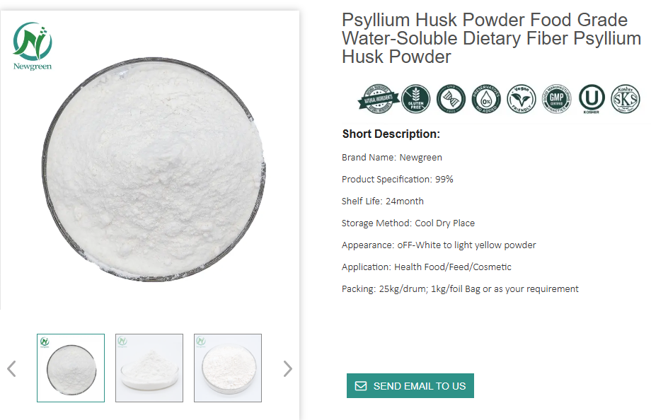 Psyllium Husk Powder is a powder extracted from the seed husk of Plantago ovata. After processing and grinding, the seed husk of Psyllium ovata can be absorbed and expanded by about 50 times. The seed husk contains soluble and insoluble fiber in a ratio of about 3:1. It is commonly used as a fiber supplement in high-fiber diets in Europe and the United States. Common ingredients of dietary fiber include psyllium husk, oat fiber, and wheat fiber. Psyllium is native to Iran and India. The size of psyllium husk powder is 50 mesh, the powder is fine, and contains more than 90% water-soluble fiber. It can expand 50 times its volume when it comes into contact with water, so it can increase satiety without providing calories or excessive calorie intake. Compared with other dietary fibers, psyllium has extremely high water retention and swelling properties, which can make bowel movements smoother.