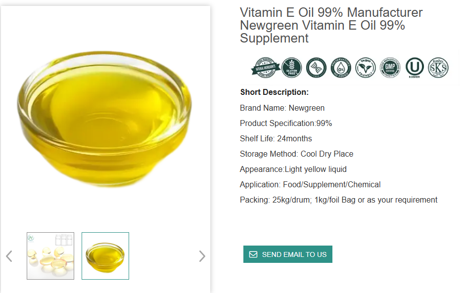 Vitamin E Oil, chemical name tocopherol, is a group of fat-soluble compounds (including α, β, γ, δ tocopherols), among which α-tocopherol has the highest biological activity.