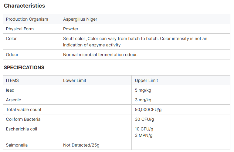 | Protează acidă de calitate alimentară (solidă 50.000) | Activitatea proteazei acide ≥ 50.000 u/g |
