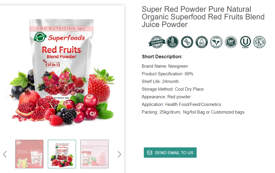 SuperrödFruktpulver är ett pulver tillverkat av en mängd olika röda frukter (som jordgubbar, hallon, tranbär, körsbär, röda druvor etc.) som torkas och krossas. Dessa röda frukter är ofta rika på antioxidanter, vitaminer och mineraler och erbjuder en mängd olika hälsofördelar.