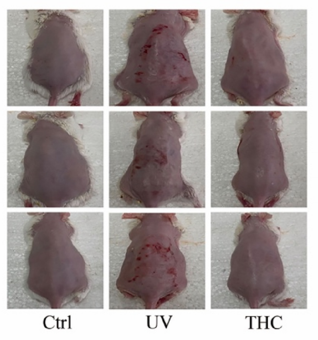 Utseendemässigt, jämfört med den normala kontrollgruppen, var huden i modellgruppen grov, med synliga erytem, sår, fördjupade och förtjockade rynkor, åtföljda av läderliknande förändringar, vilket visar ett typiskt fotoåldrande fenomen. Jämfört med modellgruppen var graden av skador hostetrahydrokurkuminGruppen med 100 mg/kg var signifikant lägre än kontrollgruppens, och ingen sårskorpor eller erytem hittades på huden, endast lätt pigmentering och fina rynkor sågs.