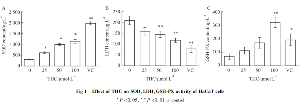 Tetrahydrokurkumin kan öka SOD-nivån, minska LDH-nivån och öka GSH-PX-nivån i HaCaT-celler.