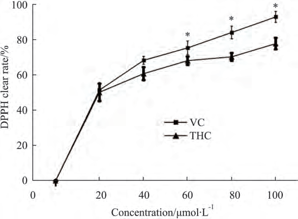 DetetrahydrokurkuminLösningen späddes 10, 50, 80, 100, 200, 400, 800, 1600 gånger i följd, och provlösningen blandades noggrant med 0,1 mmol/L DPPH-lösning i förhållandet 1:5. Efter reaktion vid rumstemperatur i 30 minuter bestämdes absorbansvärdet vid 517 nm. Resultatet visas i figuren: