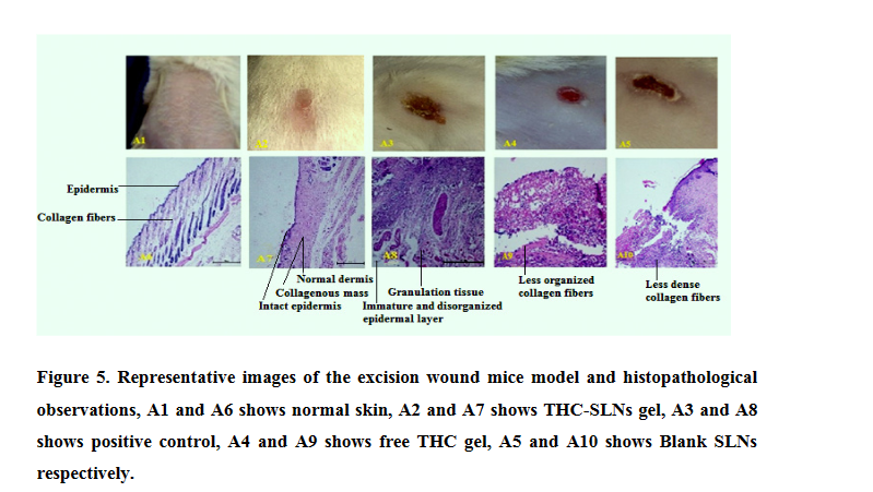 Nedan visas representativa bilder av den exciderade sårmusmodellen och histopatologiska observationer, A1 och A6 som visar normal hud, A2 och A7 som visar THC SLN-gel, A3 och A8 som visar positiva kontroller, A4 och A9 som visar THC-gel, och A5 respektive A10 som visar tomma fasta lipidnanopartiklar (SLN).